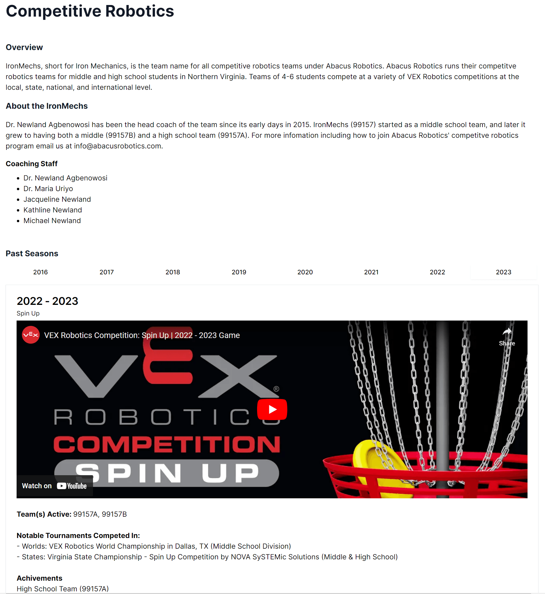Used the Tab react component to record the acheivements of Abacus Robotics VRC teams. This setup allows for updates and new seasons to be easily added.