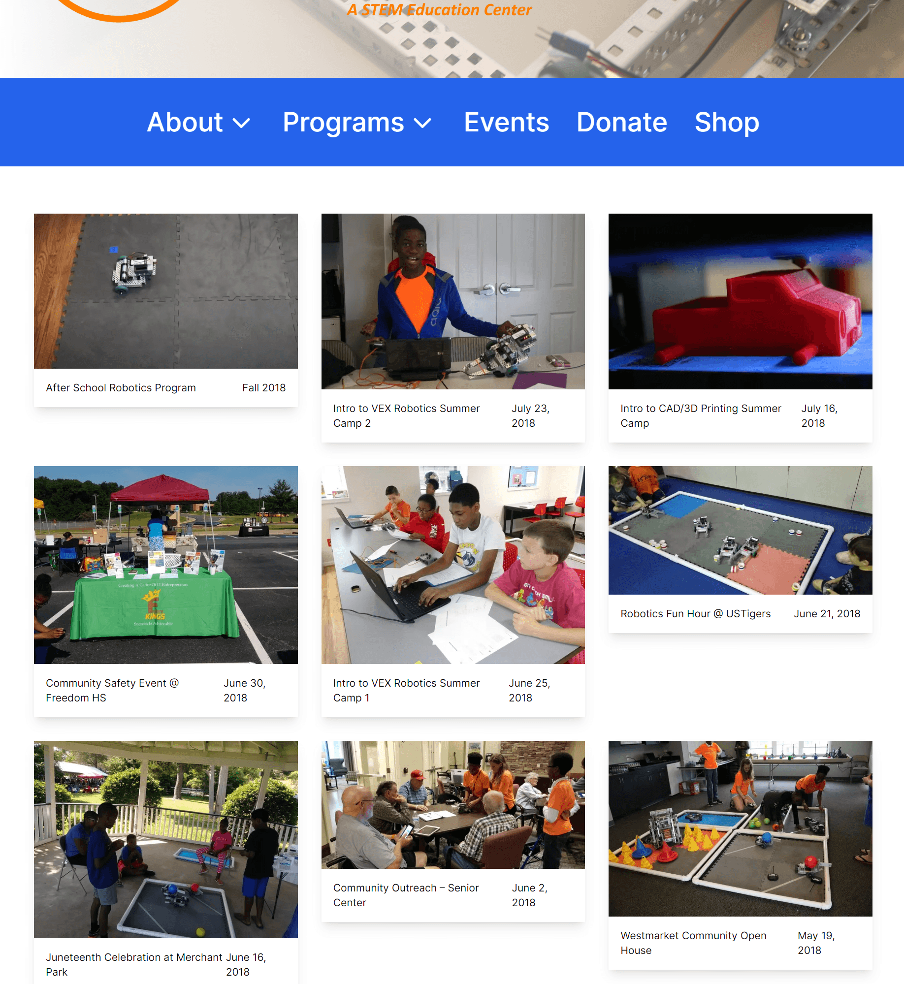 Used the map function and dynamic routes to create article pages for past community outreach events with their own media galleries.